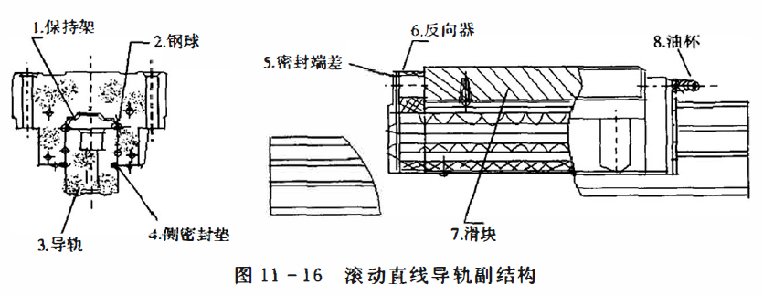 滾動直線導軌副結構由導軌、滑塊、鋼球、反向器、保持架、密封端蓋及擋板等組成。