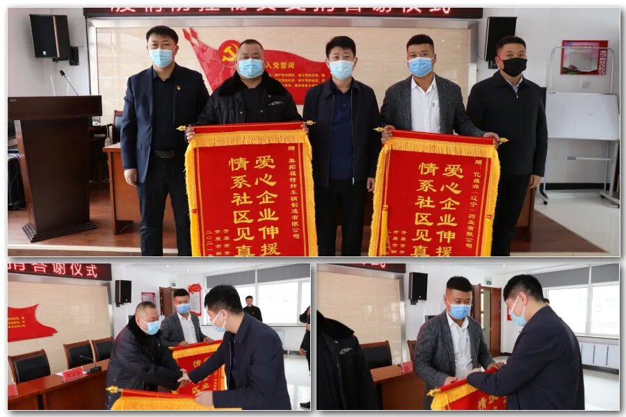 徐宏杰部長,開原街道黨委書記周玉凱、新城街道主任張巖向兩家愛心企業回贈錦旗。
