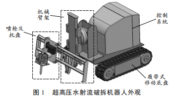 超高壓水射流破拆機器人履帶式移動底盤控制系統、機械臂架和噴槍及托盤4部分組成。