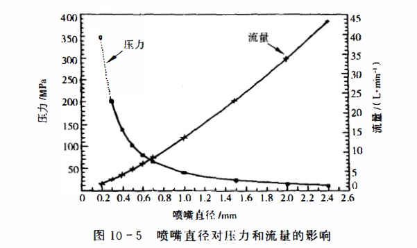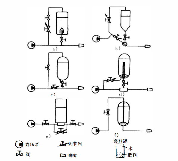 典型的磨料水懸浮液射流系統(tǒng)包括高壓泵站、 磨料混合裝置和噴頭(嘴)3部分。其中關(guān)鍵在于磨料混合裝置,它應(yīng)能調(diào)節(jié)磨料流抵并確保供料均勻通暢,圖a中,在磨料罐底部有一套由擋罩和迷宮環(huán)組成的裝置來實(shí)現(xiàn)均勻供料。圖b中設(shè)有一類似于噴 射器的特殊混合元件,同時(shí)磨料罐底部為錐形,通過調(diào)節(jié)兩邊閥的開度 來調(diào)節(jié)磨料含量并實(shí)現(xiàn)均勻供料。圖d中,磨料罐內(nèi)設(shè)有螺旋疏料桿, 以使磨料均勻下沉,防止堵塞,同時(shí)旁通水路使罐內(nèi)磨料充分流態(tài)化。 圖e中,磨料罐底部有一特殊混合腔,由于重力作用磨料落入混合腔并 與水流混合,通過調(diào)節(jié)節(jié)流閥的開度即可控制磨料供給晝。為了不使 磨料沉積,將混合腔做成環(huán)形輪胎狀是一個(gè)成功的實(shí)例。噴嘴是磨料 水懸浮液射系統(tǒng)的另一關(guān)鍵。由于噴嘴壽命影響,使用壓力受到限制。 圖10-5為圖10-4b所示裝置中測措的流蜇、壓力同噴嘴直徑的關(guān)系,其泵水功率為9.5kW。