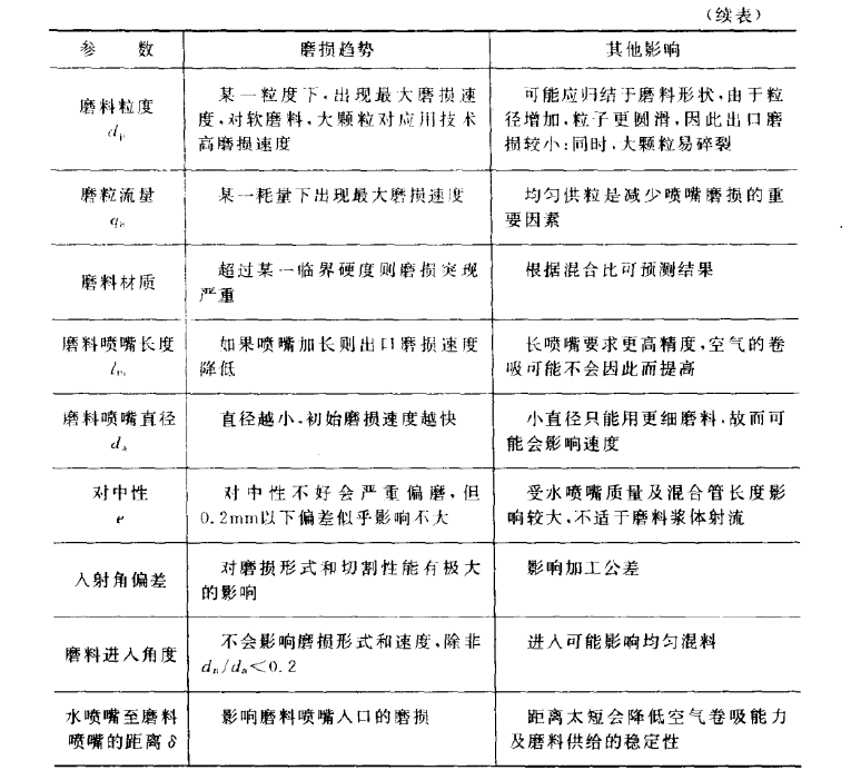 高速磨料粒子對噴嘴的磨損,性質上屬于磨料磨損的范疇。 磨料 磨損包括有滑動磨料磨損、沖擊破碎和高應力輾碎式磨料磨損、沖蝕磨 損等。 對磨料噴嘴的磨損起決定作用的是滑動磨料磨損,磨損的主要方式有微切削、微變形或疲勞。 它不僅與噴嘴的材料、形狀有關,而且磨料的粒度、形狀、硬度、滑動速度等都對其有影響,因此磨料噴嘴的磨損過程十分復雜。合理選擇射流壓力、磨料材質和粒度可有效地提高噴嘴的使用壽命;在設計和裝配過程中,應確保水噴嘴和磨料噴嘴的對中性,以使射 流處于最佳位置,防止偏磨。