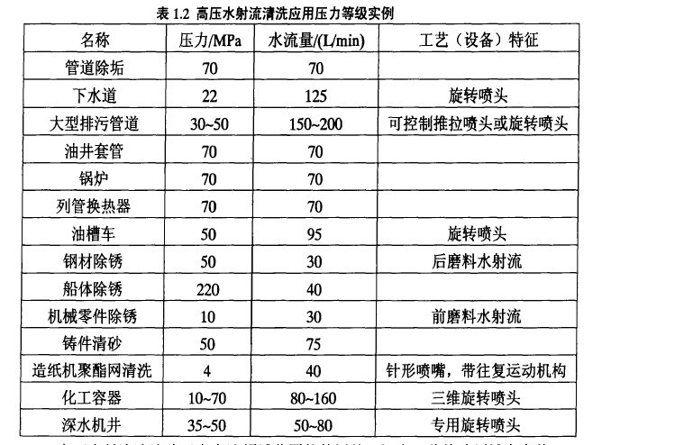 適用于高壓水射流清洗的結垢物的類型包括各種機械堵塞物、各類鹽堿結垢物、氧化鐵、金屬銹蝕物、油脂及油污凝結物、油漆、焦炭、石蠟、瀝青、石灰、石子、沉渣、淤泥、船體上的附著物及海洋生物等。表為高壓水射流清洗應用壓力等級實例。
