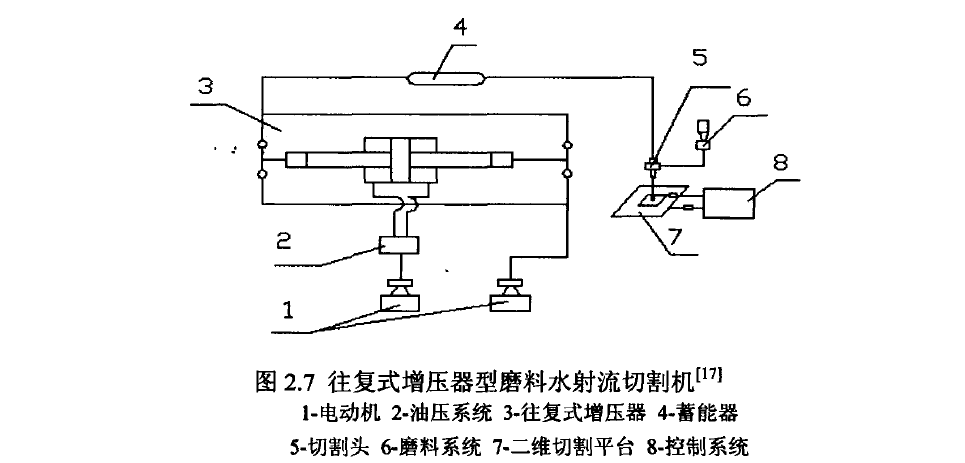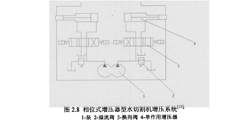 第二種是目前國外采用較多,國內普遍采用的往復式增壓器方式,其系統構成如圖2.7所示。主要由油壓系統、供水系統、往復式增壓器系統、以蓄能器為核心的恒壓系統、噴嘴和管路等組成。其特點是油壓系統采用現有的液壓技術和元件就能解決,往復式增壓器及蓄能器用戶可以自己開發研制、加工制造并非十分復雜。但往復式增壓器兩個高壓腔中的壓力相位始終相差180度,排水和吸水動作是不連續的,產生的壓力存在波動。