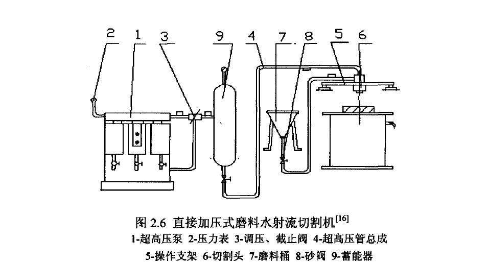 第一種是采用往復式三柱塞泵直接將水加壓到高壓或超高壓,如圖2.6所示,它被稱為直接加壓式,該結構省去了油壓系統,結構簡單、工作可靠、維護方便,水壓脈動較小,但其往復式三柱塞泵的結構復雜、精度高、價格昂貴,一般用戶不能自己生產,目前主要在高校、研究院所的試驗裝置中有所應用。