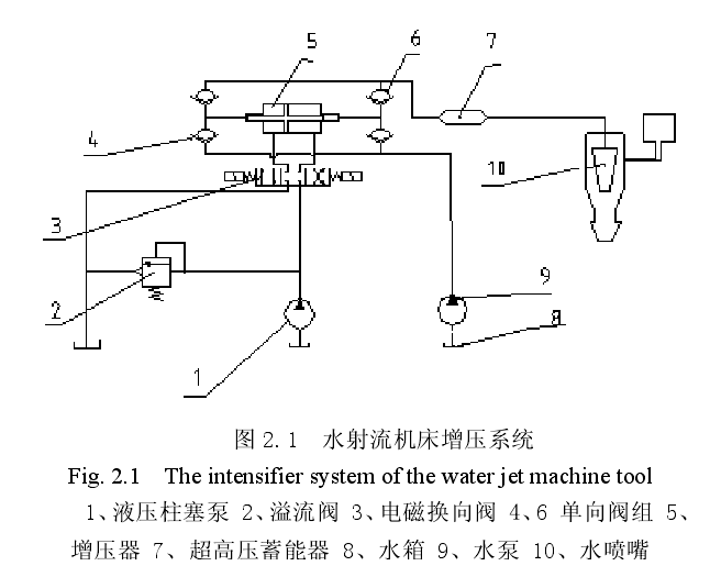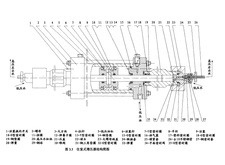 增壓器把水從幾兆帕增加到幾百兆帕,以用于水射流切割,其工作原理是基于簡單的力平衡原理。低壓油腔活塞的橫截面積是高壓水腔柱塞橫截面積的幾十倍,而活塞、柱塞連為一體。假設活塞做勻速往復運動,則活塞(柱塞)?低、高壓端受力是相同的,所以高壓端的壓強就是低壓端壓強的幾十倍的提升。?