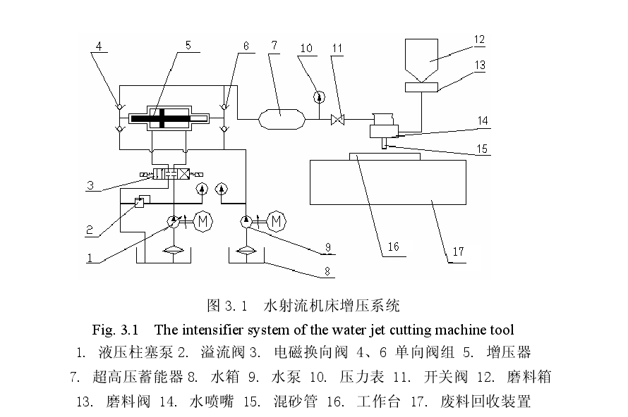 磨料水射流切割作為一種新的切割方法,它利用增壓器將水加壓,達到1 OOMPa~300MPa甚至更高的壓力。水獲得壓力能,再從細小的噴嘴噴射而出,將壓力能轉換為動能,從而形成高速射流