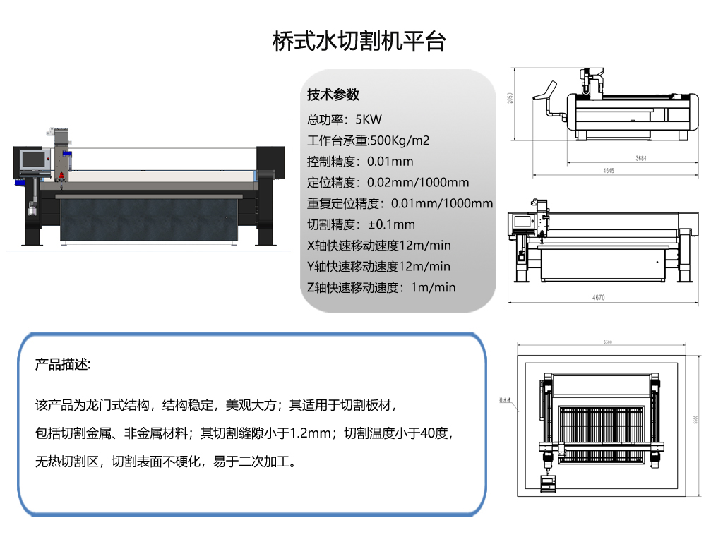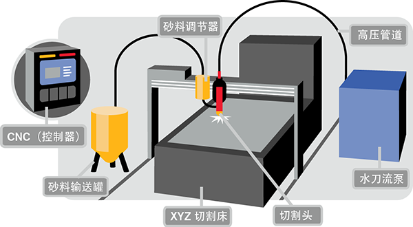 水刀數控切割平臺是水切割機中極其重要的組成部分。它主要由X軸、Y軸、Z軸傳動部分,水箱部份,切割部分,潤滑部分及數控拖動部分等組成。