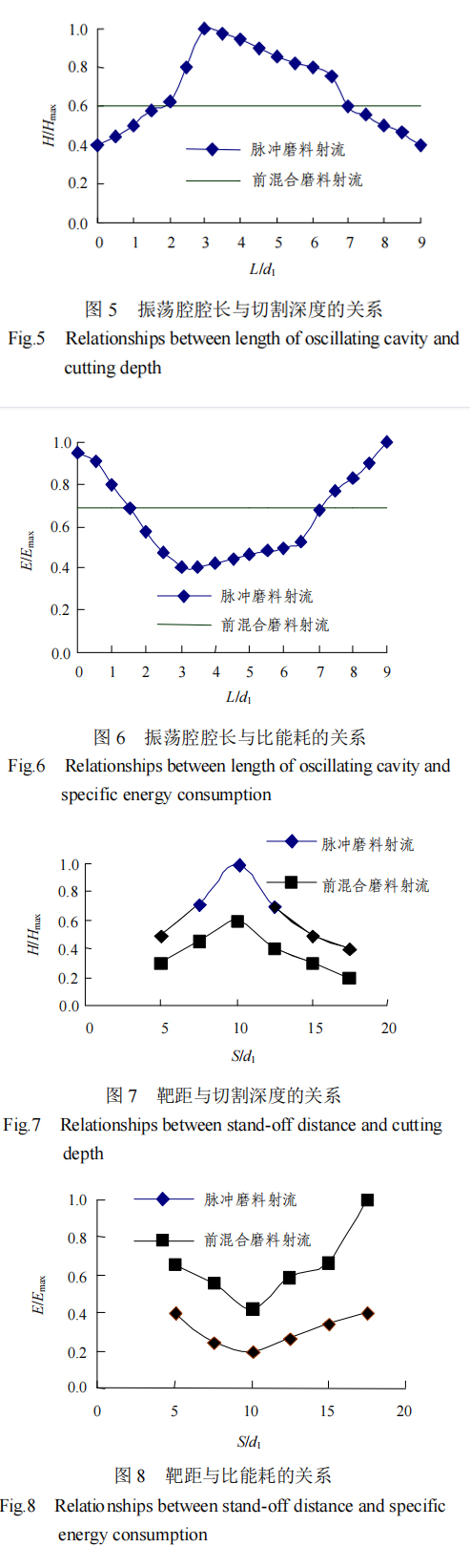 從圖 5,6 中可知 脈沖磨料水射流的最大切割深度是前混合式磨料水射流 的 1.72 倍(L/d1=3 時) 當 1.5 L/ d1 7 時,形成強烈的自激振蕩,磨料向射流中心聚集從而獲得良好的脈動加速,能量傳輸效率得到較大提高,從而使得脈沖磨料水射流切割深度增大,比能耗降低。