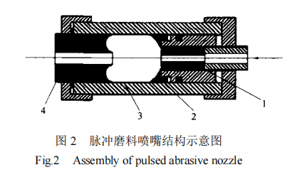 其中,脈沖磨料噴嘴如圖 2 所示主要由上、下游噴嘴1,4和碰撞壁2、振蕩腔3組成。