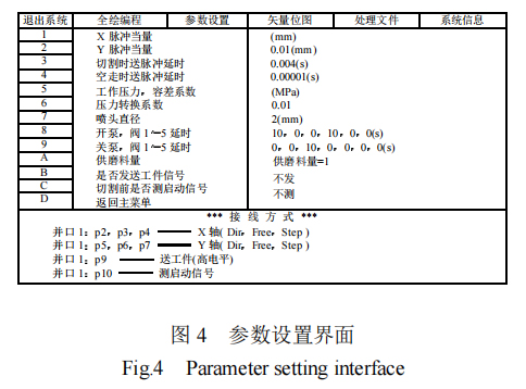 在切割之前,首先要設置好相關切割參數,如噴嘴直徑、工作壓力、磨料供給量(即磨料濃度)等,如圖 4 所示。