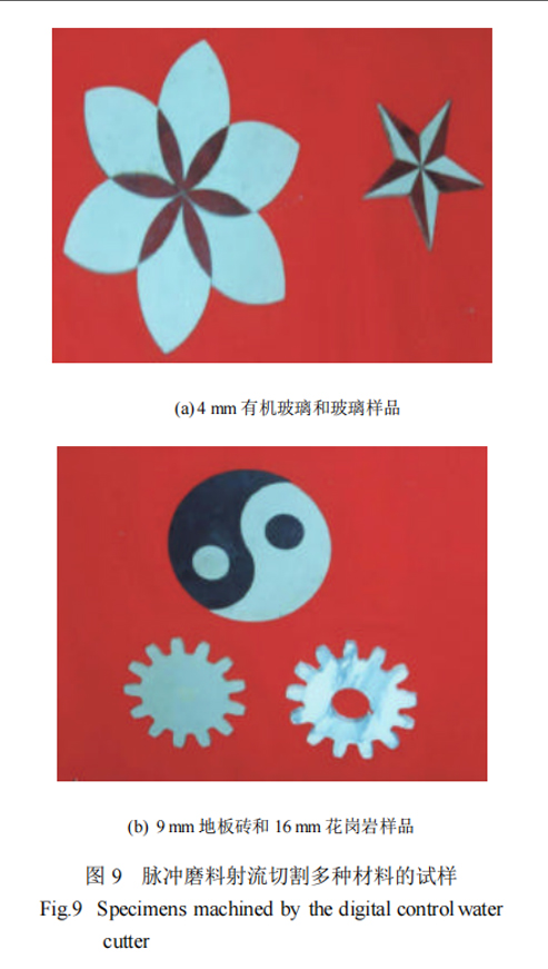 的切割深度是前混合式磨料水射流的 1.72 倍。同時在脈動狀態下,也增大了射流的有效工作靶距范圍圖 9分別是試件為厚度 4 mm的有機玻璃和玻璃樣品、9 mm 的地板磚和 16 mm 的花崗石的切割樣品[8-11]。