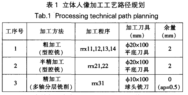 (2)立體人像加工工藝分析 。由于模型表面復(fù)雜,某些局部非常陡峭 。又受刀具系統(tǒng)及機(jī)床系統(tǒng)的約束 。給加工帶來很大難度 。鑒于上述因素 ,采用粗加工 、半精加工 、精加工的方法進(jìn)行加工 。