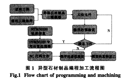 隨著人類物質(zhì)文化水平的提高以及建筑裝飾業(yè)的發(fā)展 。人們對建筑的裝飾要求也朝著美觀 、豪華、典雅的方向發(fā)展,對石材異型制品的需求越來越多 ,隨著現(xiàn)代設(shè)計(jì)制 造方 法和手 段不 斷涌現(xiàn) ,尤 其是 CAD/CAM/CAE,多軸加工技術(shù) ,仿真與優(yōu)化技術(shù) ,檢測技術(shù)等的發(fā)展 ,使復(fù)雜異型制品的設(shè)計(jì)、加工等不再難以實(shí)現(xiàn) 。利用虛擬制造技術(shù)在計(jì)算機(jī)上模擬真實(shí)加工 ,可以提高產(chǎn)品加工質(zhì)量 ,降低廢品率 ,縮短制造周期 ;通過對模 型的各個部分進(jìn)行參數(shù)化描述 ,并根據(jù)具體模型,對其各個部分進(jìn)行參數(shù)化控制 ,提高復(fù)雜異型制品模型的建模效率 。圖 1為異型 石材制品編程加工流程圖。