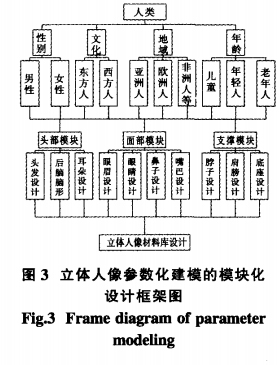 針對某一具體的人,可以把人的身體分成各個模塊,大體上包括:頭部模塊,面部模塊和支撐模塊 ;以頭部模塊為例 ,頭部模塊設(shè)計(jì)包括發(fā)型設(shè)計(jì) 、腦形設(shè)計(jì)和耳朵設(shè)計(jì),而發(fā)型設(shè)計(jì) 又包 括 卷發(fā) 和直 發(fā) 的設(shè) 計(jì) ,無論是卷發(fā)還是直發(fā)又都有長短之分 以及是扎辮子還是披肩發(fā) 等等 ,通過對各 模塊進(jìn)行設(shè)計(jì) ,建立立體人像的材料庫 ,使得以后如果需要再構(gòu)建立體人像的模型 ,可以從材料庫中進(jìn)行加載 ,并通過修改參數(shù)和不同模塊的組合形式來建立不同的立體人像模 型,從而大大降低了設(shè)計(jì)難度 。提高了立體人像的設(shè)計(jì)效 率 ,簡化設(shè)計(jì)流程 。 圖3為 立體人像參數(shù)化建模的模塊化設(shè)計(jì)框架圖 。