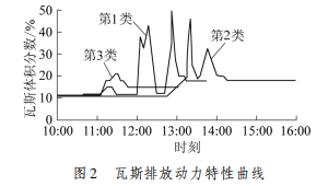 為分析割縫作業時孔內瓦斯動力特性,利用瓦斯探頭測量各鉆孔內瓦斯濃度演變特性,由實際觀測可知其變化特征均相異,較為復雜。但就整體而言,可以按探頭監測到的最大峰值將瓦斯排放現象分為以下3類(圖2):