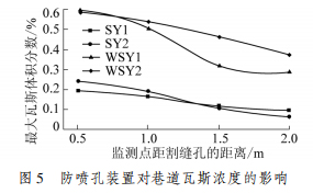 2)防噴孔裝置應用效果分析。割縫作業時,選擇 4個距離接近的割縫孔,其中,2個使用防噴孔裝置,記作SY1、SY2;余下不使用,記作WSY1、WSY2測量距割縫孔不同位置處的瓦斯濃度變化,取觀測段內瓦斯濃度最大值繪圖(圖5),由圖5中可知,使用防噴孔裝置后,周邊巷道瓦斯濃度大幅受抑,基本控制在0.3%以下,未出現瓦斯超限現象。而未使用時瓦斯濃度較大,最高達0.61%。顯然,該裝置對巷道瓦斯抑制明顯,可以保證現場施工的安全性。