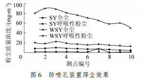 為考察該裝置的降塵特性,采用CCHZ-1000全自動粉塵測定儀對距割縫孔不同距離處(測點布置間距為1m)的全塵及呼吸性粉塵濃度進行分析,并比較SY(使用防噴孔裝置)與WSY(未使用防噴孔裝置)2種情況下的測試結果,如圖,6所示。