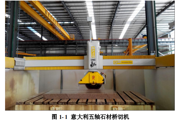 意大利 ISAC 公司生產(chǎn)的五軸石材橋切機,如圖 1-1 所示,采用 CNC 控制,集切割和雕銑功能于一體,具有非常便捷的人機交互功能,能夠完成平面切、立體切、仿形和異形等加工功能??刂葡到y(tǒng)兼有繪圖軟件,其自帶的圖形庫可滿足大部分用戶需求,同時還可根據(jù)實際加工需求自定義加工圖形。功能強大的圖形編輯功能,可完成多個圖形的自動排布、干涉判斷及自動處理、軌跡顯示和移動旋轉(zhuǎn)等。另外,還具有視覺功能,對于大型板材加工時定位困難和不準(zhǔn)等情況,可實現(xiàn)自動對刀和定位。大大提高了自動化和智能化程度,具有高效率、高精度和高可靠性等優(yōu)點,在國內(nèi)市場廣受好評。