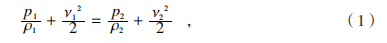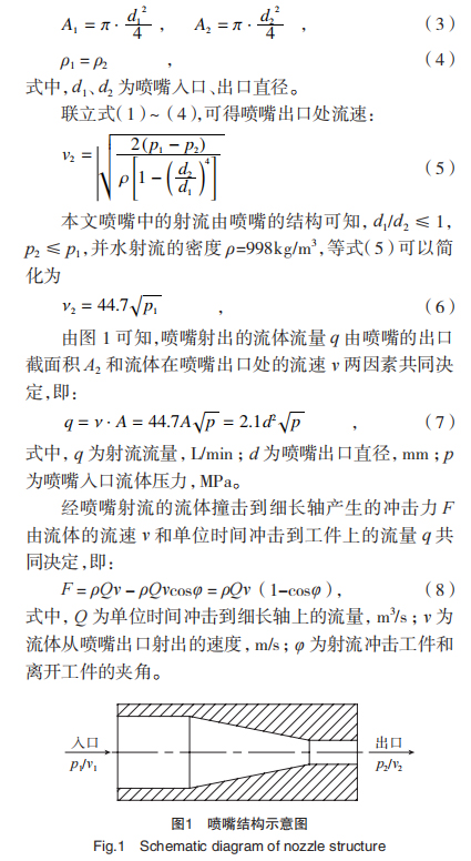 式中,p1、p2 為流體流過噴嘴入口、出口流體產生的壓力;v1、v2 為流體流過噴嘴入口、出口的均速;ρ1、ρ2 為流體流過噴嘴前、后的密度。射流在噴嘴中流動可簡化成流動參數只在某個方向有變化而其他方向的變化忽略不計的一元流動問題,并射流在噴嘴中連續流動,即可得下式: