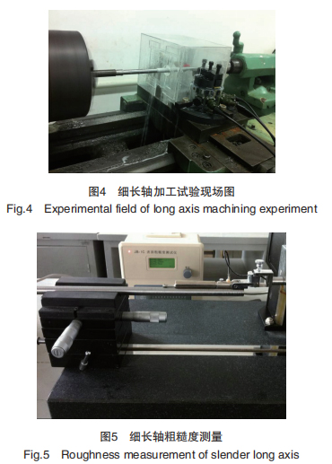 本文首先任選一組細長軸進行普通車削加工,加工完成后采用 JB-1C 型粗糙度測量儀對其初始端及中間位置的表面進行粗糙度測量;再將細長軸按照本文提出的射流輔助支撐方法進行加工,車削加工完成后同樣其在同一位置進行粗糙度測量,測得的結果分別由打印機打印出來。細長軸加工試驗現場圖如圖 4 所示,粗糙度測量圖如圖 5 所示。