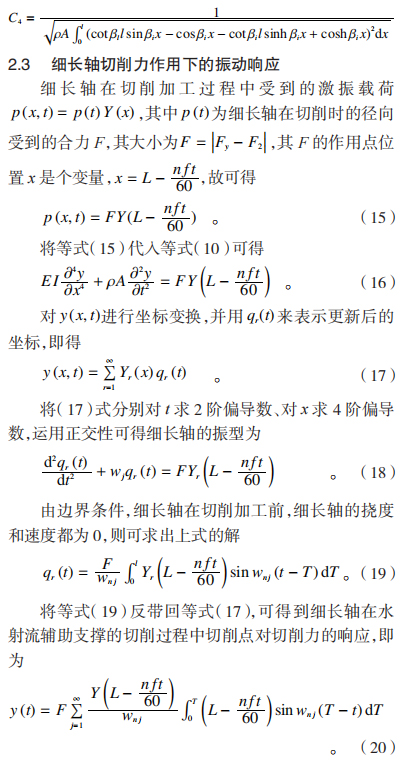 本文針對低剛度細長軸在切削加工過程中因切削力作用而容易產生振動尺寸誤差,將水射流技術應用到細長軸柔性輔助加工,以此提高細長軸的剛度抑制其振動尺寸誤差,并通過研究了細長軸在水射流輔助支撐作用時的振動特性,獲得細長軸輔助支撐時受切削力的響應方程,從理論上驗證了水射流輔助支撐可很大減小細長軸的振動。最后,通過試驗驗證水射流輔助支撐技術可有效地提高細長軸的剛度和加工精度。
