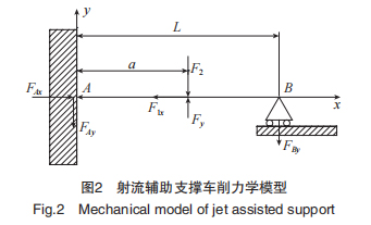 本文中細長軸采用的裝夾方式為頂針式。根據該裝夾方可知細長軸的受力模型可以簡化成工程上的超靜定梁問題,簡化后的受力模型如圖 2 所示??ūP對細長軸的約束可以簡化為 FAx、FAy 和彎矩 MA ;車刀在 xoy平面對細長軸產生的切削分力簡化為 F1x、Fy;射流對細長軸產生的沖擊力簡化為 F2 ;頂針對細長軸的約束簡化為支座約束反力 FBy。