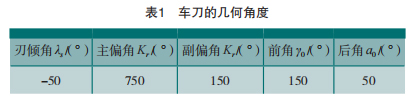 為了驗證本文提出的以射流輔助支撐抑制細長軸振動的有效性,分別選兩組細長軸分別進行有無射流輔助支撐加工的實驗。細長軸的毛坯尺寸為 ,材料為 45 號鋼。試驗中采用的加工參數如下:背吃刀量ap=0.2mm,進給量 f =0.1mm/min,切削速度 Vc=60m/min ;切削液射流發生系統中的參數如下:泵壓為 P=6.5MPa,噴嘴直徑d=2mm,噴距 L=1mm;采用的刀具是硬質合金車刀,刀具具體幾何角度如表 1 所示。