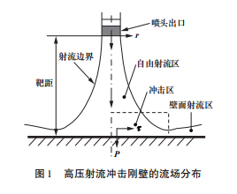 高壓射流清理材料表面過程的流場按其流動特性 可分成 3 個區域:自由射流區、沖擊區和壁面射流區, 如圖 1 所示[5] 。 自由射流區內,射流受壁面的影響非 常小,因此可認為該區域的流動特性與自由射流相同。 在沖擊區,射流急速改變方向,由軸向流動變為徑向流 動并且存在極大的壓力梯度。 該區域是引起壁面發生 彈塑性變形,甚至塑性去除、脆性去除或斷裂的集中區 域。 壁面射流區的流動速度減弱,而且相對平穩,因此 一般不會發生壁面材料變形或去除[6] 。