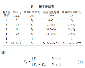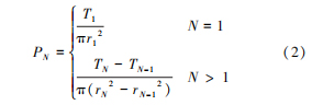 當N=1時,為第一圓盤沖擊力值與測力圓盤面積的比 值;當 N>1 時,為該徑向位置沖擊力值與該位置環形 增量面積的比值,單位為 Pa,即: