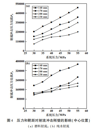 表明:在靶距不變的情況下,無論純水射流還是磨料射流,其中心(最高壓力)位置的沖擊壓力和系統壓力呈正相關。 純水射流在靶距140mm 時,沖擊壓力明顯大于其他3個靶距(170,200 和 230 mm)的沖擊壓力;而對于磨料射流,沖擊壓力隨靶距增大,近似等速率降低,呈負相關變化。
