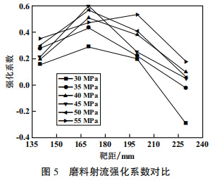 圖5為不同系統工作壓力下,不同靶距位置磨料射流強化系數的對比。
