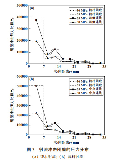 1) 建立了專用射流測力工作臺,利用不同直徑圓盤承受沖擊力的差值得出了純水和磨料射流沖擊剛壁的壓力分布。 磨料射流除沖擊壓力顯著增加外,和純水射流具有相近的壓力分布。 射流沖擊力隨徑向距離增加急速降低,是一非單調遞減階梯函數,可視其為具非單調負指數下降規律,而非切割小口徑噴嘴射流形成的高斯分布規律。