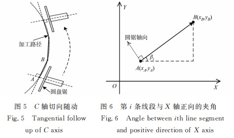 使用圓盤鋸加工圓弧,需使圓盤鋸的軸向與圓弧上每一點的切線方向保持垂直,即C軸跟隨刀具的切向而轉動,稱為C軸切向隨動.用小線段擬合圓弧之后,圓盤鋸的軸向要與路徑上的每一段小線段保持垂直,如圖5所示,這就需要計算犆軸在第i條小線段的切向隨動角度Ci。