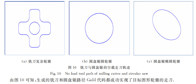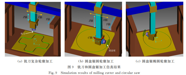 由仿真結果可知:利用生成的 G 代碼,銑刀和圓盤鋸都可以加工出目標圖形輪廓;且圓盤鋸加工過程中,實現了C軸切向隨動,Δθ取更小的值可以滿足更高的的機床精度要求求。