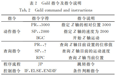 Galil代碼是 Galil運動控制卡使用的加工指令,指令從功能區分可以分為動作指令、查詢指令和程序流程控制指令。部分指令及說明(Galil代碼中的A,B,C軸分別對應于機床的X,Y,Z 軸),如表2所示。