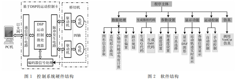 的多功能化、自動化、數控化[3-6]。設計多功能、高效率、高自動化、加工范圍廣的石材數控橋切機,是石材加工行業發展的迫切要求[7-8]。國外已將傳統普通橋切機升級為多功能、數控橋切機,實現圓鋸片在XY平面360°回轉和鋸片擺頭功能[9-10]。金成毅等[11]采用可編程邏輯控制器(PLC)控制系統實現了石材分片自動切割,此系統只用三軸進行直線切割,是目前國內石材行業普遍采用的切割方式。劉玉梅[12]采用PC+RTX()+I/O 卡結構,使用 VC++ 開發三軸數控系統,然而,該系統只用銑刀進行簡單異型板材輪廓加工,加工范圍有限。文獻[13-14]采用 PC+運動控制卡結構,使用 VC++ 開發四軸數控系統,但這些討論只針對圓弧輪廓。針對上述問題,本文設計了石材橋切機控制系統,使用直線擬合法[15-17]以加工小線段的形式進行曲線輪廓加工;同時,使用 C#語言編程,生成刀路 G 代碼用于 VeriCut軟件進行機床仿真,生成 Galil代碼用于下載到運動控制卡進行機床走刀。