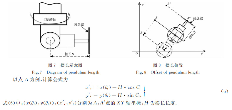 為了加工目標軌跡AB,由于擺長(圖7)的存在,圓盤鋸實際加工軌跡是A″B″。因此,需對AB的坐標平移一個擺長的距離,把AB平移到A′B′,如圖8所示。