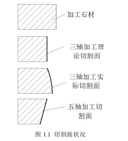 在中國(guó)制造 2025 的大環(huán)境下,為了快速促進(jìn)制造業(yè)產(chǎn)業(yè)化升級(jí),朝著“互聯(lián)網(wǎng)+”的發(fā)展趨勢(shì),將信息化和工業(yè)化進(jìn)行融合,把重點(diǎn)放在開發(fā)新一代科技信息技術(shù)產(chǎn)業(yè),如高檔數(shù)控機(jī)床、機(jī)器人結(jié)構(gòu)機(jī)床、航空航天制造業(yè)、先進(jìn)軌道交通和電力裝備、新型材料、生物醫(yī)療器械裝備及農(nóng)業(yè)器械裝備等[1]。參與制定泉州制造 2025 規(guī)劃及市級(jí)“燎原計(jì)劃”重大關(guān)鍵技術(shù)解決方案有工業(yè)機(jī)器人控制器開發(fā)及產(chǎn)業(yè)化,高性能交流伺服驅(qū)動(dòng)及電機(jī)的研制與跨行業(yè)示范應(yīng)用以及國(guó)產(chǎn)數(shù)控技術(shù)在熱熔膠器涂布復(fù)合機(jī)的應(yīng)用、節(jié)能伺服系統(tǒng)在制鞋業(yè)行業(yè)的應(yīng)用、衛(wèi)生用品多軸同步張力控制系統(tǒng)的研制與應(yīng)用、高精度柔性折彎?rùn)C(jī)專用數(shù)控系統(tǒng)研發(fā)與推廣應(yīng)用、高性能數(shù)控激光設(shè)備的研發(fā)與推廣應(yīng)用、石材專用數(shù)控設(shè)備的研發(fā)與實(shí)踐應(yīng)用推廣等國(guó)產(chǎn)數(shù)控系統(tǒng)產(chǎn)品開發(fā)與示范應(yīng)用。數(shù)字化、網(wǎng)絡(luò)化及智能化是傳統(tǒng)制造業(yè)進(jìn)行轉(zhuǎn)型升級(jí)的主要考慮方向,也是制造業(yè)未來發(fā)展的一個(gè)必然趨勢(shì)[2]。從“數(shù)代”到“智能一代”,泉州華中科技大學(xué)智能制造研究院作為泉州市政府培養(yǎng)的重點(diǎn)企業(yè),也將努力為實(shí)施“中國(guó)制造2025”強(qiáng)國(guó)戰(zhàn)略做出應(yīng)有的貢獻(xiàn)。 近年來,隨著“超高壓數(shù)控水切割機(jī)床”技術(shù)的不斷更新和完善,數(shù)控水切割機(jī)床在市場(chǎng)上已逐漸推廣和應(yīng)用。水切割是利用水(純水或是加磨料的水)噴射的動(dòng)能對(duì)工件進(jìn)行加工,它可以對(duì)反光型材料、復(fù)合型材料、化學(xué)纖維、熱敏感型材料及玻璃陶瓷等材料進(jìn)行加工;水刀切割相比于激光切割、電火花切割等切割方式有以下一些優(yōu)點(diǎn):是一種冷態(tài)切割,切割面沒有熱變形;水切割在加工過程中沒有發(fā)生材料的化學(xué)變化,即不影響切割材料物理性質(zhì);切割工件表面清潔且環(huán)保等[3]。對(duì)于三軸的水切割數(shù)控系統(tǒng),由于能量梯度和水的聚焦發(fā)散作用,切面越深時(shí)(距噴嘴越遠(yuǎn)時(shí)),水切割能力就會(huì)越差,所切割出的切割面與工件表面經(jīng)常就會(huì)不垂直,切割面如圖1.1 所示,雖然可以通過提高水的能量或是降低水切割的速度可以減低部分不垂直度,但是大部分水刀切割石材產(chǎn)品都用于石材水刀拼花(即石材工件與石材工件鑲嵌的過程,不同顏色或不同形狀也可以都相同的石材工件),這就需要切割面有一定的傾斜度,以更好的鑲嵌,使邊緣的拼縫小且美觀大方。這些都是三軸水切割數(shù)控系統(tǒng)機(jī)床無法完成的。為了解決切割不垂直度的問題,五軸聯(lián)動(dòng)的水切割數(shù)控機(jī)床概念就被提了出來,它的基本原理是:在原有三個(gè)直線軸 X、Y、Z 的基礎(chǔ)上再加兩個(gè)擺動(dòng)軸 A、B 或 A、C 或 B、C,來實(shí)現(xiàn)水刀刀頭向任意方向的擺動(dòng),并用 RTCP(Realtime Transport Control Protocol)技術(shù),將控制點(diǎn)定在刀具的中心點(diǎn),通過實(shí)時(shí)刀具長(zhǎng)度補(bǔ)償確保刀具的中心點(diǎn)沿著指定的路徑移動(dòng)[4]。從而使水切割產(chǎn)品達(dá)到無斜度切面或形成指定角度的切面。