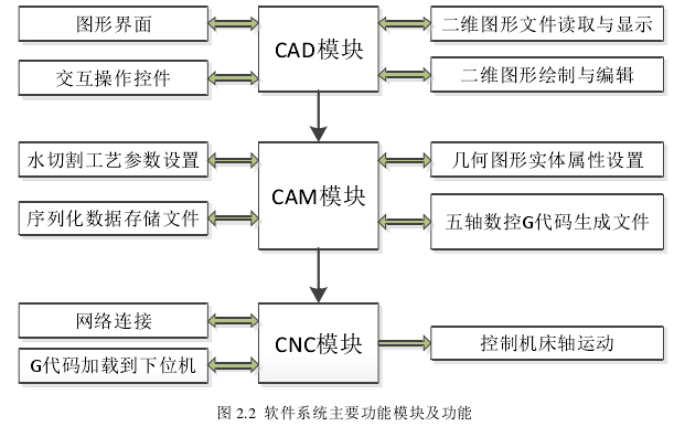 根據中小企業對五軸聯動石材水刀切割技術的要求及專用數控系統開發目的,對所開發的 CAD/CAM 一體化的五軸聯動水刀切割專用數控系統擬采用上下位機的形式,即 CAD/CAM 一體化軟件運行在上位機,從而可以在上位機將 CAD/CAM 一體化軟件生成的五軸數控 G 代碼傳至華中 8 型數控系統下位機,直接驅動機床軸的運動。CAD/CAM 一體化上位機軟件的主要功能模塊如圖 2.2