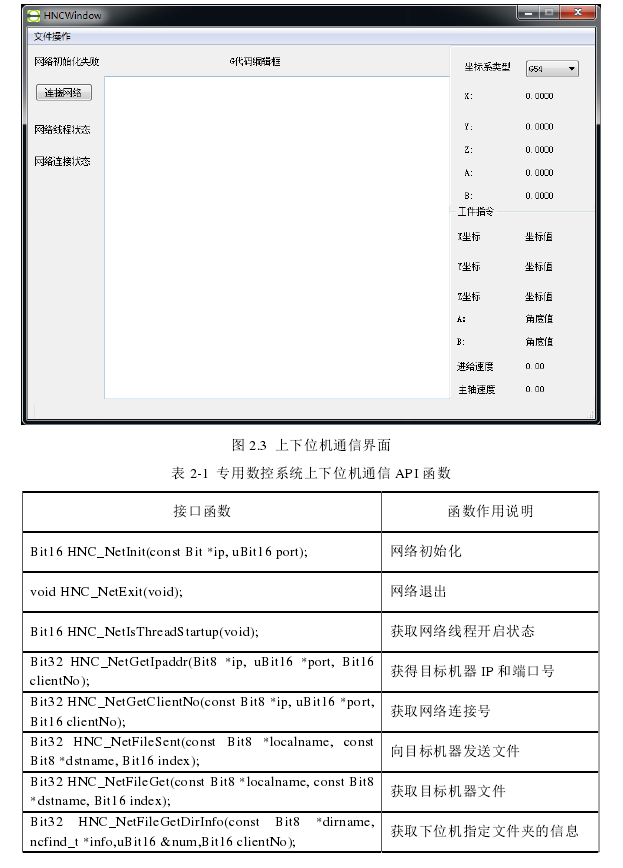 本文研究的 CAD/CAM 一體化的五軸聯動水刀切割專用數控是上下位機的系統構成,上位機是在 Windows 平臺上利用 Qt Creator 開發的 CAD/CAM 一體化軟件,下位機是華中 型數控系統。針對五軸水刀切割特殊加工工藝和控制要求開發了專用數控系統。其中上位機與下位機的通信主要是通過華中 型數控系統提供了一個以太網口(通過網線連接)進行網絡連接來獲取下位機信息,及將上位機有關信息傳送到下位機,如將上位機軟件生成的五軸數控 代碼發送給下位機。擬開發的 CAD/CAM 體的五軸聯動水刀切割專用數控系統上下位機通信的界面如圖 2.3 所示,專用數控系統二次開發通信的 APIApplication  Programming  Interface)函數主要如表 2-1 所示。CAD/CAM