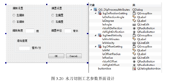 并且通過函數 set Water Cut Process Data(RS_Water Cut Process Data const &data)來設置水刀切割數據,通過函數 get Water Cut Process Data()來得到水切割數據。水刀切割工藝參數設計界面及用到的 Qt 組件如圖 3.20 所示。