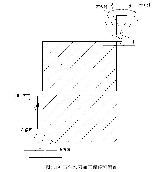對于五軸水刀切割加工而言,它相對于三軸多了角度偏轉的問題。水刀切割的工藝參數主要有左偏轉、右偏轉、偏轉角度、左偏置、右偏置、偏置半徑、進給速度等,其中工藝參數偏轉和偏置描述簡圖如圖 3.19 所示。CAD 模塊中有點、直線、圓弧、圓、橢圓polylinepolygonspline 等實體種類,這些幾何實體圖形在繪制中保存時只是存儲了點的坐標、圖層及塊等概念,然而沒有將具體加工這些圖形時所需的水切割加工工藝參數設置并保存。這些實體類型不但具有各自的特征,而且還具有共同的特征,所以先建立一個基類,存儲共有的屬性及行為操作,然后再從基類派生出這些不同種類的子類實體類型,存儲各自特有的屬性和行為操作。水刀切割加工工藝參數就屬于這些實體共有的特性,因此在它們的基類中定義結構體數據: