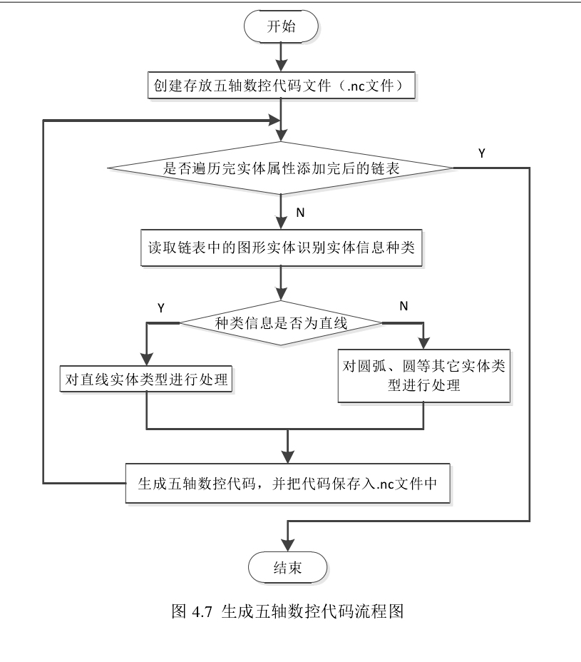 對完成圖像實體排序、換向及水刀加工工藝參數添加等操作后鏈表中的數據進行處理,得到五軸數控加工 G 代碼。由于五軸水刀在對石材工件進行切割時水刀中心離工件邊緣軌跡存在一個水刀半徑的偏置,因此刀觸點到理想刀位點需要經過一個水刀半徑補償,即將刀觸點向遠離工件的方向(即點的軌跡的法線方向)平移刀具距離 r,得到指定工件坐標下繪圖點的坐標,然后將偏置后的點的坐標帶入上述根據方向一致性和位置一致性算出的 d1、d2、d3、A、B 中求出編程坐標,最后根據編程坐標點輸出G 代碼到.nc 文件中。在本 CAD/CAM 一體化軟件系統中,由于時間和精力有限,只處理直線實體類型組成的圖形,沒有處理如圓弧、圓、橢圓、polyline、polygon 等實體類型組成的圖形。如對于直線,由于軌跡點的偏置,就會引入一段拐角處的軌跡,在這里直接以 C 刀補的方式進行處理,即拐角處以直線段的方式來處理,如圖 4.6 所示,若加工軌跡為矩形 ABCD,則水刀除了加工 A’B’、B”C’、C”D’、D”A”直線段外,還要多加工 B’B0、B0B”、C’C0、C0 C”、 D’D0、D0 D”、A”A0、A0 A’等直線段軌跡。根據加工的兩段軌跡的矢量夾角 α 和刀補方向的不同,拐角處的處理方式可以分為:當 α≥180°時,為縮短型;當 90°≤α<180°時,為伸長型;當α<90°時,為插入型。這種 C 刀補拐角處處理方式的特點為:相比于 B 刀補(拐角處以圓弧銜接)尖角工藝性好,且可實現過切自動預報(在內輪廓加工時),避免產生過切,從而保證切割出圖形軌跡的正確性。在對鏈表的數據結構進行處理時,先判斷圖形實體類型,如是直線表示為“RS_Line”,如是圓弧表示為“RS_Arc”等,然后再具體到針對特定實體類型信息進行處理,生成五軸數控加工 G 代碼,保存到.nc 文件中。五軸數控代碼自動生成的流程圖如圖 4.7 所示。