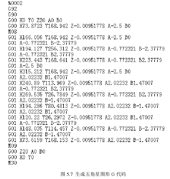本文生成的五軸數控代碼適用于 AB 擺五軸聯動石材水刀切割專用數控機床。例如上述自定義的加工零件圖形在完成排序、換向、水刀加工工藝參數添加及五軸坐標變換的后置處理等操作后,點擊菜單欄“File”菜單中的子按鈕“Save”或“Save as…”子按鈕,彈出保存文件的對話框,保存成.nc 格式的文件,點擊保存 即可。此時五軸數控代碼就被保存在.nc 文件中,用記事本或其它軟件打開此文件,G 代碼內容如圖 5.7 所示。