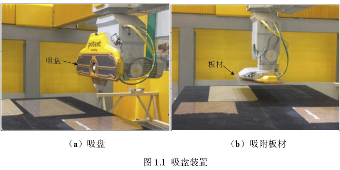 目前,一些發達國家的五軸加工設備,數控化、自動化、多功能化已成為常態。以公認的石材設備大國意大利為例,該國GMM(意美美)公司的五軸數控加工設備刀具可在水平面做3600旋轉,在前后或左右方向做0°-90°翻轉;機頭的刀罩裝有真空吸盤,能夠自動吸附并搬運板材,如圖1.1(a)所示為真空吸盤,圖1.1(b)所示為吸盤吸附并搬運板材;切割圓弧、任意曲線等異形板材使用圓盤鋸,其切割效率高于高壓水切割機,并且切割后工件邊緣光滑、無毛邊,同時還避免了高壓水飛濺的危險;由于刀具可在水平面做3600旋轉,能夠加工回轉體(如圓柱造型、羅馬柱加工、紐紋柱加工等);使用圓盤鋸并利用水平面3600旋轉功能,能夠加工如球座、浴盆、洗手盆等有內腔的石材產品,如球形洗臉盆加工,可實現內外球面一次裝夾加工,加工出的產品表面光滑、形狀標準,而國內鮮有這種加工;由于刀具可在前后或左右方向做0°-90°翻轉,使用圓盤