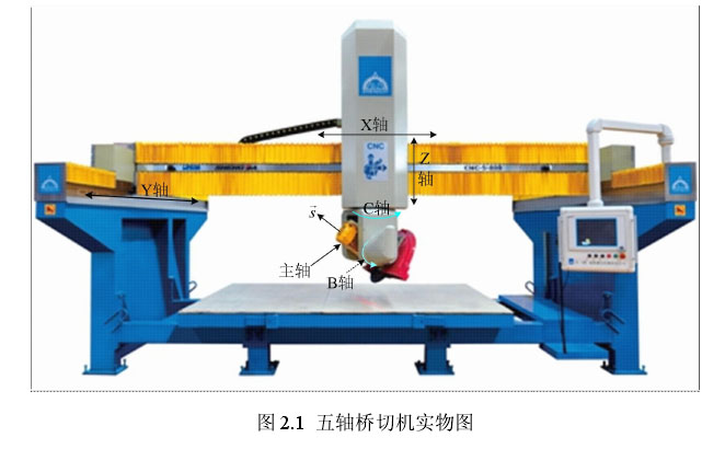 圖2.1為五軸石材橋切機實物圖,其結構類型為1.1.1節中的刀具旋轉型,旋轉軸組合形式為B-C形,其運動部件為X運動軸、Y運動軸、Z運動軸、C旋轉軸、B翻轉軸。