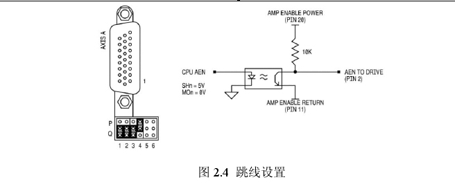 DMC-4080提供的放大器使能方式有:高電平放大器使能(HAEN、低電平放大器使能(LAEN ) , 5 V邏輯、 12V邏輯、24V的外部電源等。每軸放大器使能電路可通過跳線分別設置的,每個不同配置的跳線設置和電路圖如圖2.4所不。