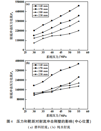 下圖給出了純水和磨料射流在不同系統工作壓力和靶距的情況下,最大沖擊壓力(中心位置)的比較。
