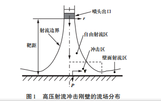高壓射流清理材料表面過程的流場按其流動性分成3個區域,自由射流區、沖擊區和壁面射流區,自由射流區內,射流受壁面的影響非常小,因此可以認為該區域的流動性與自由射流相同,在沖擊區射流急速改變方向,由軸向流動變為徑向流動,并且存在極大的壓力梯度。該區域是引起壁面發生彈塑性變形,甚至塑性去除、脆性去除或斷裂的集中區域。壁面射流區的流動速度減弱,而且相對平穩,因此一般不會發生避免材料變形或去除。