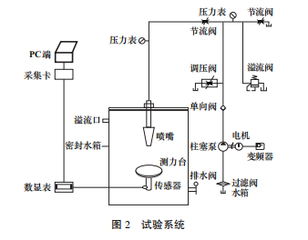 為研究高壓水射流與高壓磨料射流對剛壁沖擊力的分布規律,設計了高壓水射流測力系統,整個系統包括高壓射流系統、測力系統與電控系統3個部分。高壓射流系統由高壓栓塞泵、水箱、過濾器、調節閥、單向閥、壓力表、節流閥、溢流閥、噴頭等組成:測力系統由測力臺、測力傳感器、數顯表、采集卡、PC端等組成,電控系統主要是通過變頻器對電機實施變頻控制。試驗時,把設置靶距參數,選定測力臺,開啟高壓射流系統,通過變頻器調節電機轉速控制系統水壓至設定值,由PC端采集記錄工作臺下的沖擊力值。測力臺承受射流沖擊的面積為圓形,由N個圓盤構成,按照面積從小到大進行編號,其直徑為 7N+1mmN1,221),由標準1kg砝碼對照數顯表進行標定,利用兩相鄰圓盤的射流沖擊力的差值,確定其各階段沖擊力值。